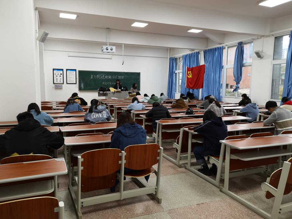 在考试开始前,监考人员宣读考试规则并分发试卷。本次考试以党建、党史、党章、习近平系列讲话、党的十九大、两会为主要内容,全面检验了同学们对国家时事的了解程度、对中国共产党的认知深度、对党员身份的理解程度。在整个考试过程中,每位同学都认真对待,巡考人员亦专心致志。考试结束后,考生陆续上交试卷,监考人员仔细核对并装袋封卷。至此入党积极分子测评顺利结束。