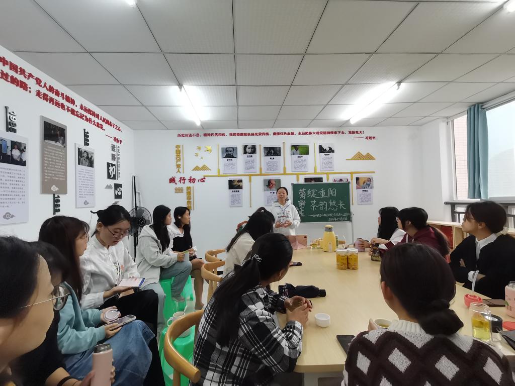 周静益同志介绍了重阳节的由来、名称含义及习俗,加深同学们对这一中国传统佳节的了解,增强了参与热情。活动过程中,同学们体验了冲泡菊花茶,热切谈论不同地区重阳节习俗,并分享了有关重阳节的诗词。活动最后,同学们共品菊花茶,诉说心得感悟,纷纷表示这是一次富有意义的体验。