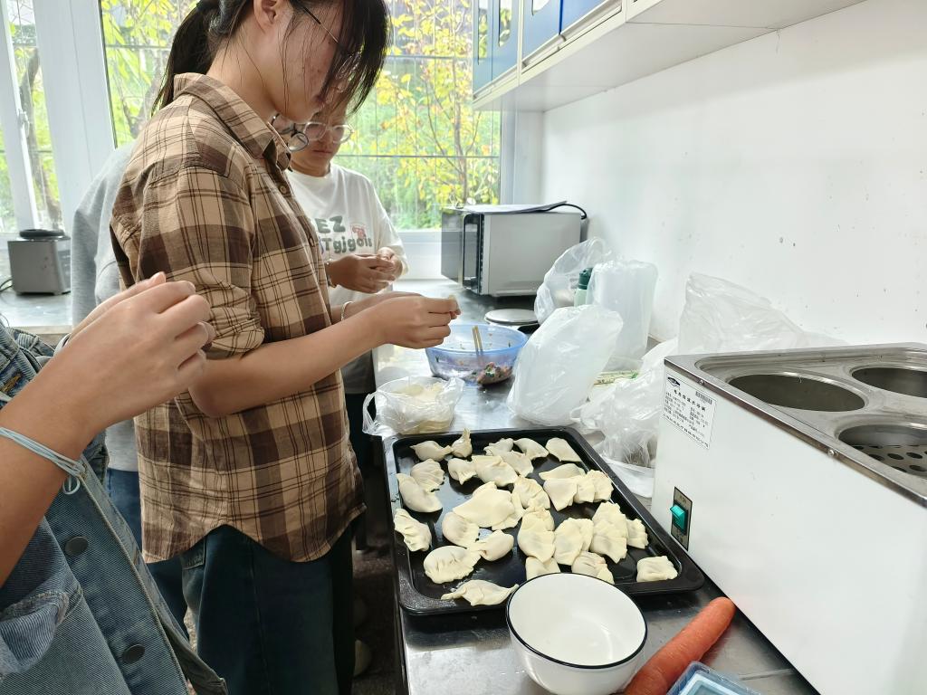 活动前,吴佳佳同学为大家介绍了有关立冬的文化习俗,她提到:“立冬吃饺子,是我们中华民族的传统习俗,它不仅仅是一种食物,更是亲友团聚、幸福美满的象征。”活动中,大家分工明确,备食材、调馅料、包饺子,每一步都充满了欢声笑语。当一盘盘热气腾腾的饺子出锅,大家围坐在一起品尝着自己的劳动成果,感受立冬的温暖与美好,纷纷分享关于立冬吃饺子的美好记忆。