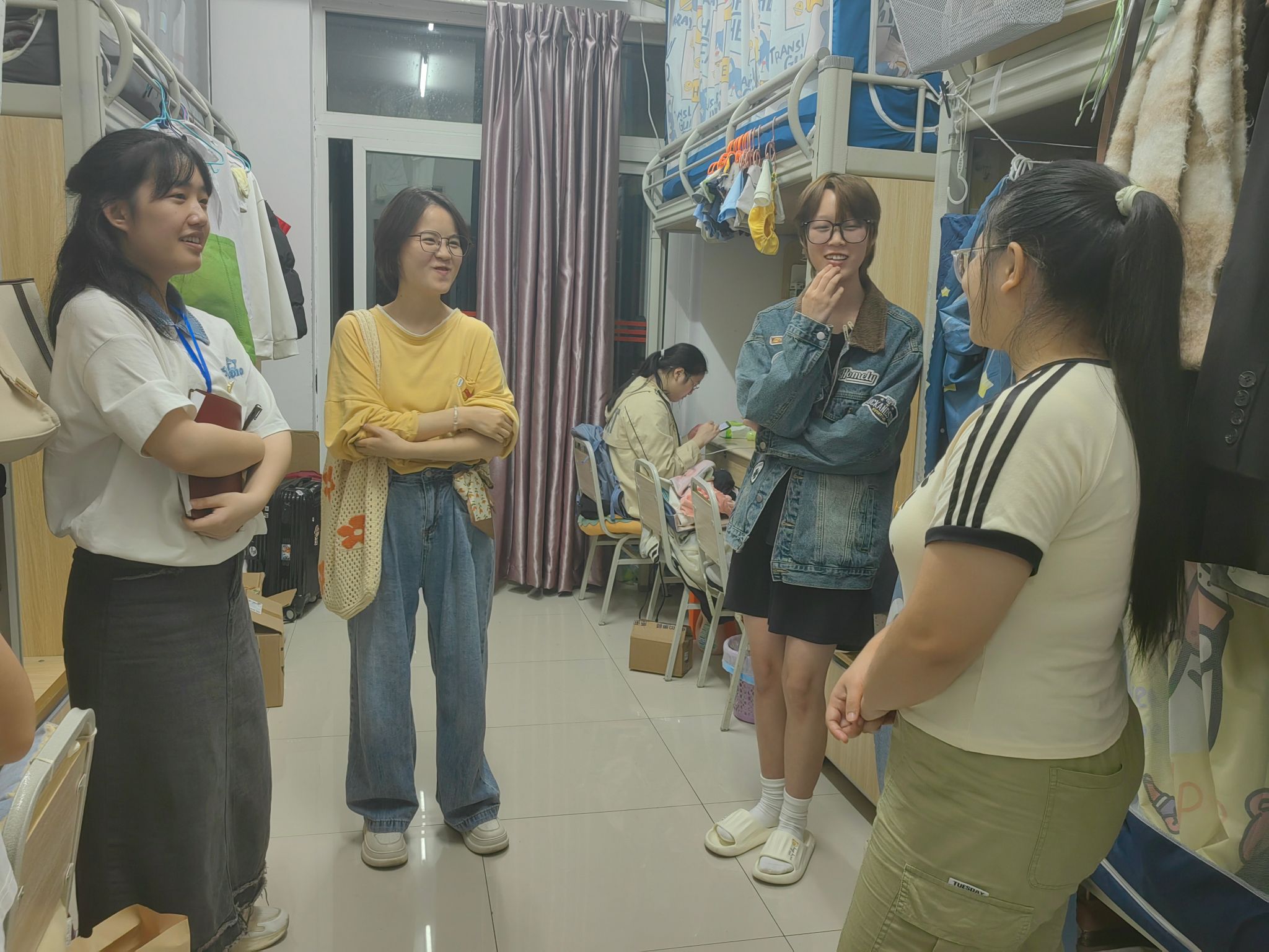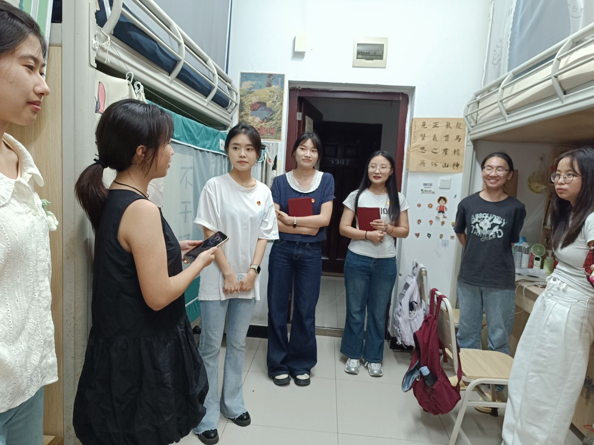 本次参与进寝的员工党员为周琴(女)、吴云露(女)、向玲(女)、原赫遥(女)、黎欢(女),分别来自公司员工第一党支部与员工第二党支部。在初心工作站工作人员带领下,党员同志分组进入不同寝室,向同学们宣传党的理论知识与入党基本流程,引导大家积极向党组织靠拢;又以“朋辈身份”开展面对面交流,围绕学业规划、考研备考、生活困惑等话题提供解答,并鼓励同学们在大学期间勇于尝试、提升自我。
