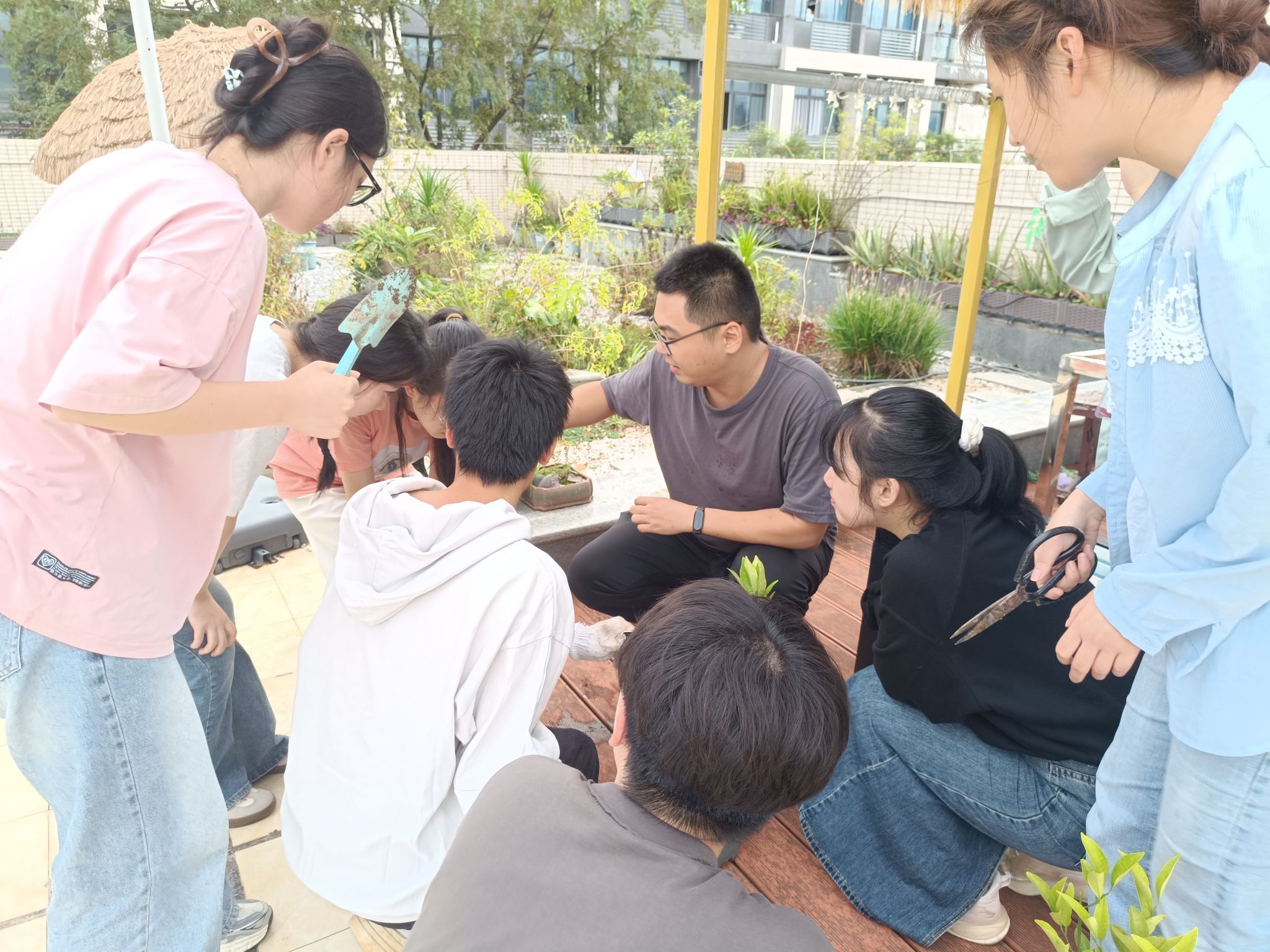 活动前期,李老师开展了简单的植物科普,介绍了常见的植物病虫害,如叶锈病、烟煤病等。随后,志愿者们带着工具共同参与盆栽的修剪与养护工作。在老师的指导下,志愿者们分工协作,认真修剪残枝败叶,清理杂草,确保每一株植物焕然一新。最后,大家共同为盆栽喷洒水分,细心呵护这些绿色的生命。
