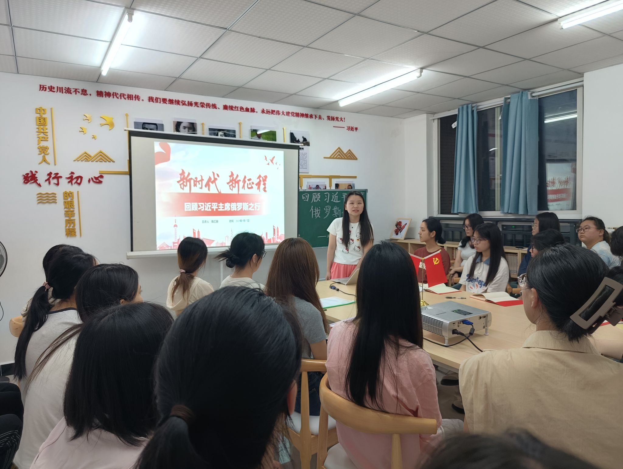 陈红丽同志通过俄罗斯之行概述、纪念世界反法西斯战争胜利80周年、纪念联合国成立80周年、了解学习中俄之间的合作与担当四个板块,系统梳理了习近平主席此次访问的战略意义、实践成果与时代价值,引导全体同学在理论学习中坚定理想信念、强化使命担当。活动中,参加人员集中观看了反战题材影视《小士兵》的片段,孩童的天真与战争的残酷形成强烈对比,让大家陷入沉思,更加珍惜和平的来之不易。陈红丽同志表示,和平与发展已经成为时代主题,但战火尚未在这颗星球完全熄灭,单边主义、保护主义逆流涌动,国际局势中不稳定不确定因素增多,战争的达摩克利斯之剑依然悬在人类头上,渴望和平的呼声愈发响亮,大家要以史为鉴、面向未来,共同珍爱和平、维护和平。