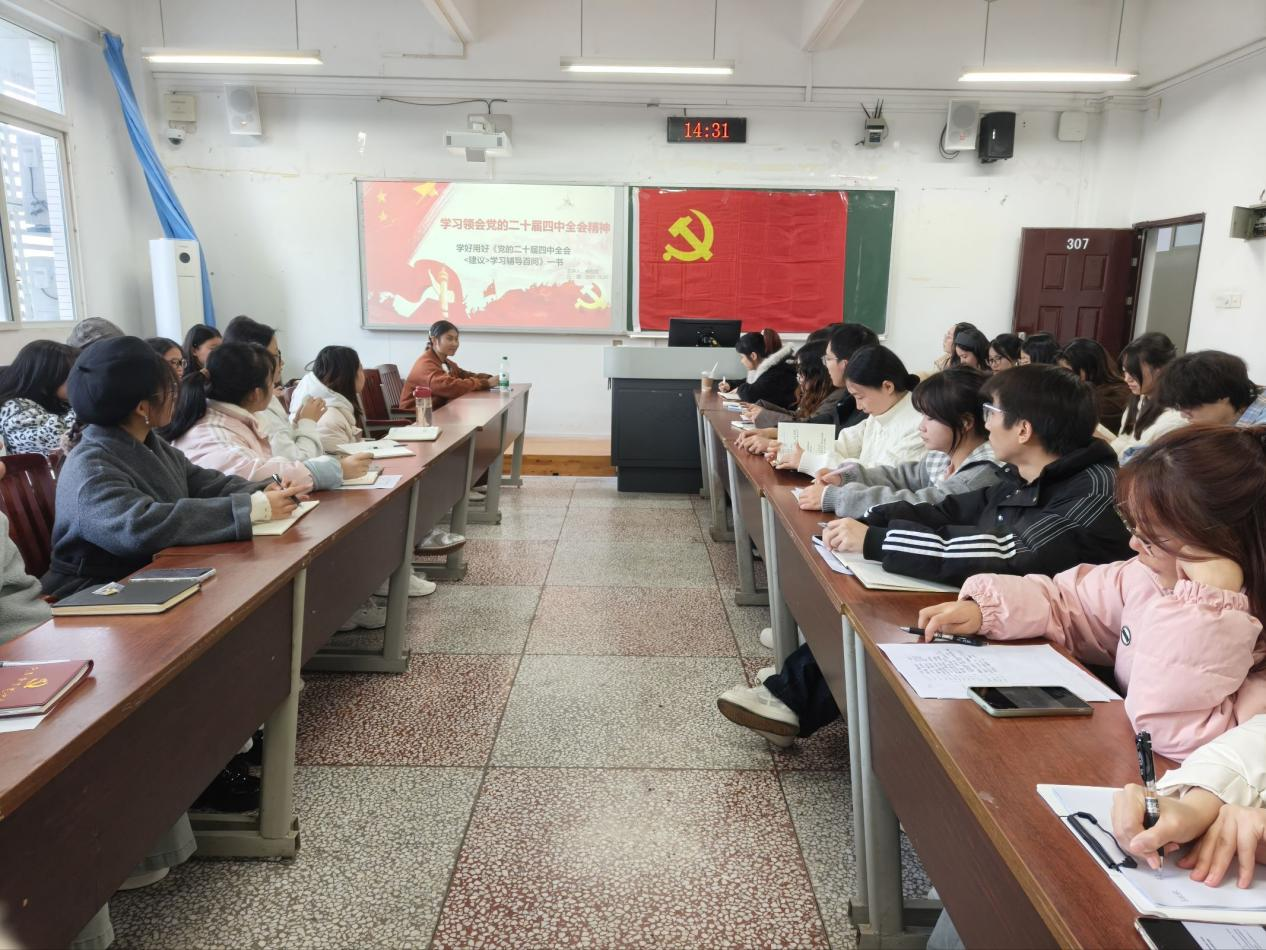 为深入学习贯彻党的二十届四中全会精神,3044永利集团员工第一党支部于2025年11月20日在明辨楼1-307教室组织开展主题党日活动。本次活动共有正式党员、预备党员、发展对象和入党积极分子46人参加。