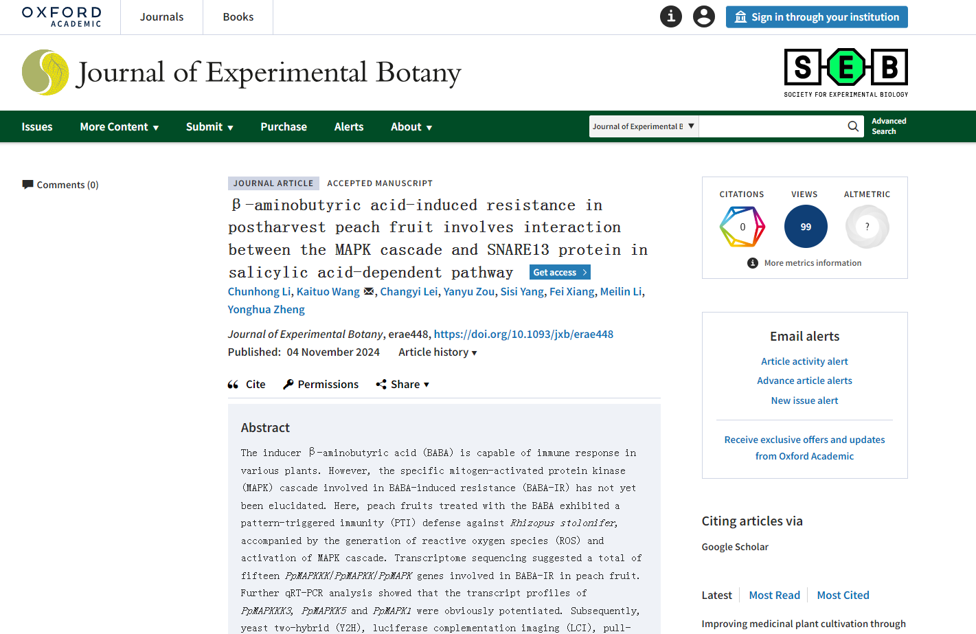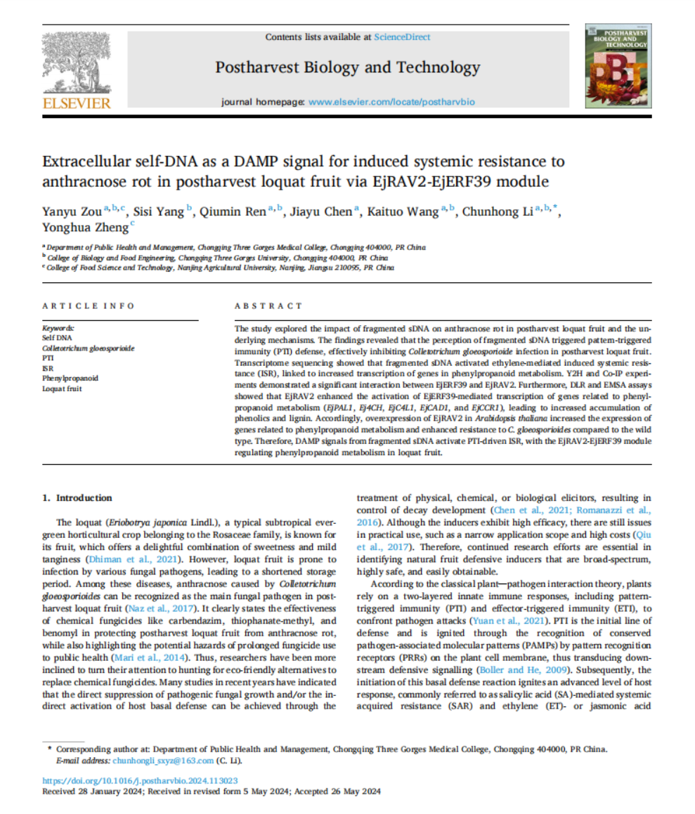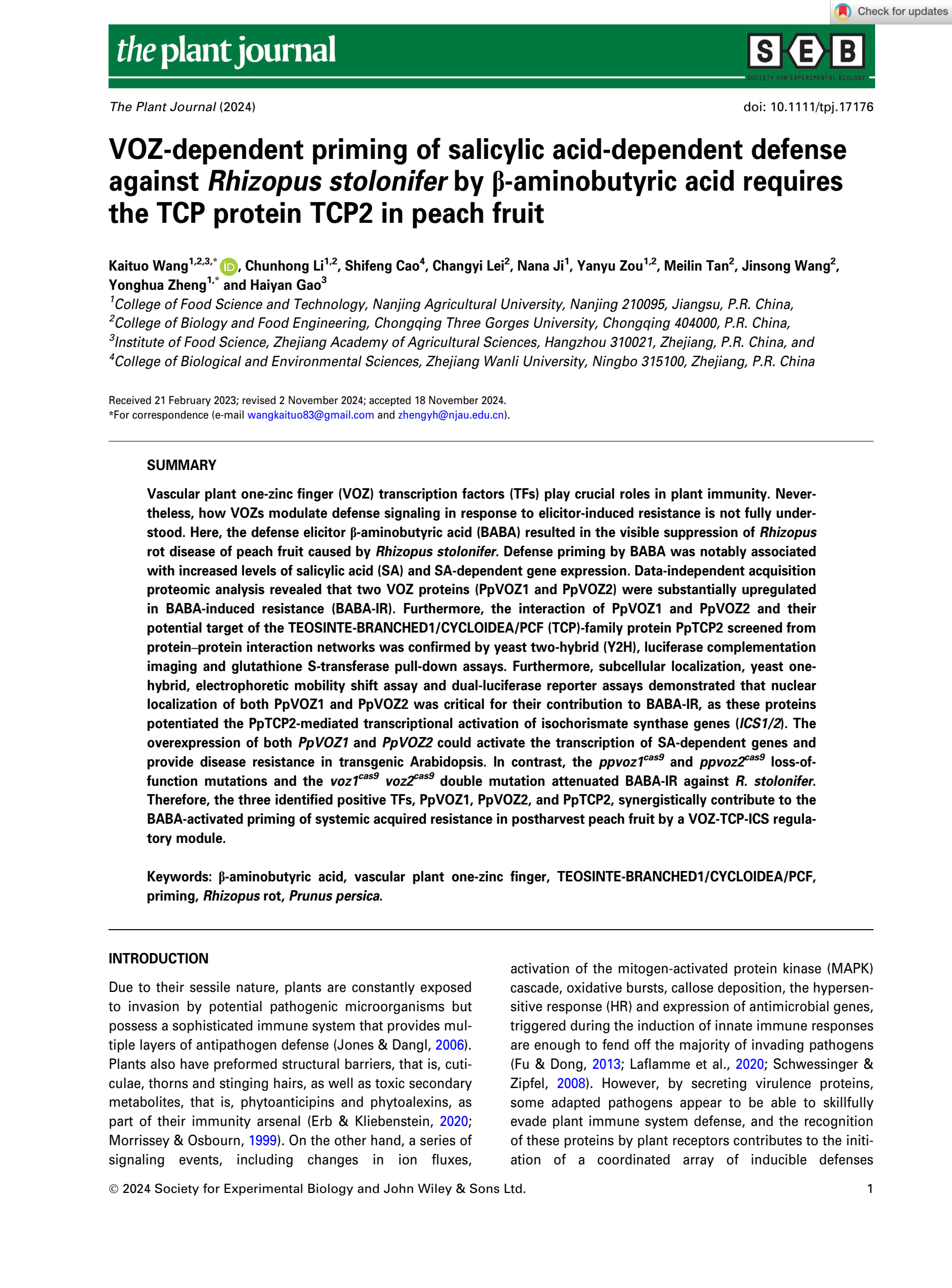近日,3044永利集团教师在植物学经典期刊《The Plant Journal》和《Journal of Experimental Botany》和采后生物学期刊《Postharvest Biology and Technology》上分别发表了三篇重要论文。首篇《VOZ-dependent priming of salicylic acid-dependent defense against Rhizopus stolonifer byβ-aminobutyric acid requires the TCP protein TCP2 in peach fruit》由汪开拓作为第一兼通讯作者,联合南京农业大学郑永华团队,发现维管植物单锌指转录因子(VOZ1和VOZ2)通过调控TCP2和ICS基因,显著增强了桃果对Rhizopus stolonifer的抗病能力;次篇《β-aminobutyric acid-induced resistance in postharvest peach fruit involves interaction between the MAPK cascade and SNARE13 protein in salicylic acid-dependent pathway》由三峡医专黎春红作为第一作者,汪开拓为通讯作者,阐明了诱导剂β-氨基丁酸(BABA)在桃果中激活的MAPK级联反应及其下游因子SNARE13在提升水杨酸依赖防御中的关键作用;第三篇《Extracellular self-DNA as a DAMP signal for induced systemic resistance to anthracnose rot in postharvest loquat fruit via EjRAV2-EjERF39 module》由已毕业本科生邹燕羽为第一作者,系统揭示自源性DNA诱导对枇杷果实抗性反应中的诱导作用。这三项成果为植物免疫机制和抗病育种提供了新的科学依据,推动了农业可持续发展的研究进展。