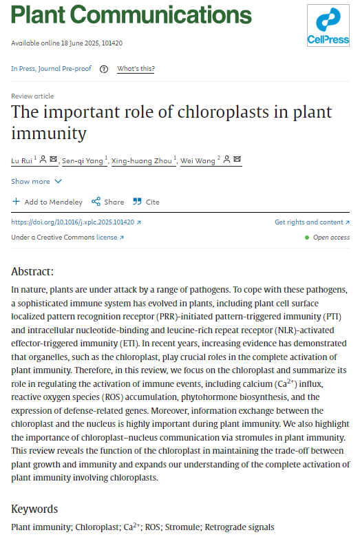 近日,3044永利集团教师芮璐以第一作者和共同通讯作者身份,与福建农林大学王伟教授合作在植物学国际卓越期刊《Plant Communications》(中国科公司一区TOP期刊,最新影响因子11.6)上发表题为《The important role of chloroplasts in plant immunity》的综述论文。该论文系统总结了近年来叶绿体在调控钙离子内流、活性氧(ROS)积累、植物激素生物合成以及叶绿体—细胞核逆行信号等免疫激活事件中的核心作用,阐释了叶绿体在维持植物生长与免疫平衡方面的重要功能,拓展了植物免疫系统中涉及叶绿体通路全面激活的理解视角,对未来抗病植物分子育种提供了理论依据与研究方向。