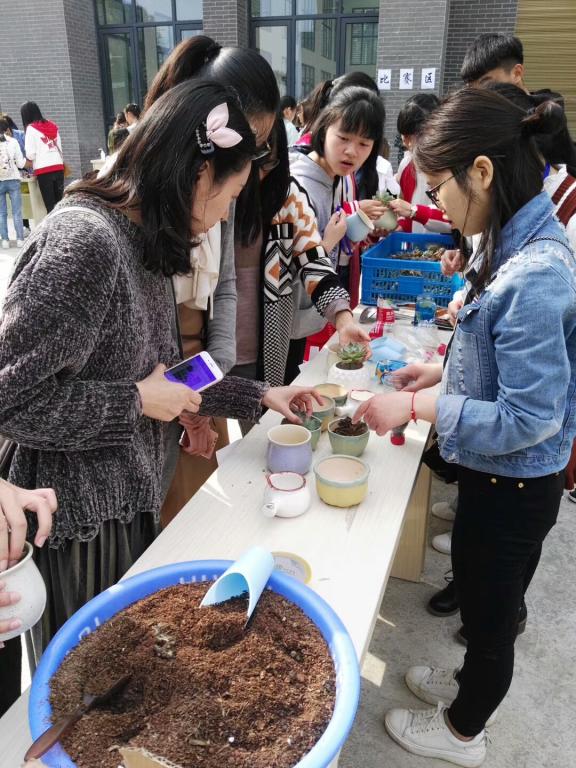 整个系列活动持续一整天,效果良好。参加微型盆栽大赛的8组选手自选材料、自行设计创意、自己动手栽种,历经一个半小时的现场创作,八组作品不仅外观美,而且创意美;既有表现山水的、风景园林的,也有表现家庭、同学、师生情谊的,引来了不少师生驻足观摩。另外,以“最强记忆”和“全是套路”呈现的多肉游戏环节也让师生们在欢乐中学到了一些多肉栽种和养护常识。