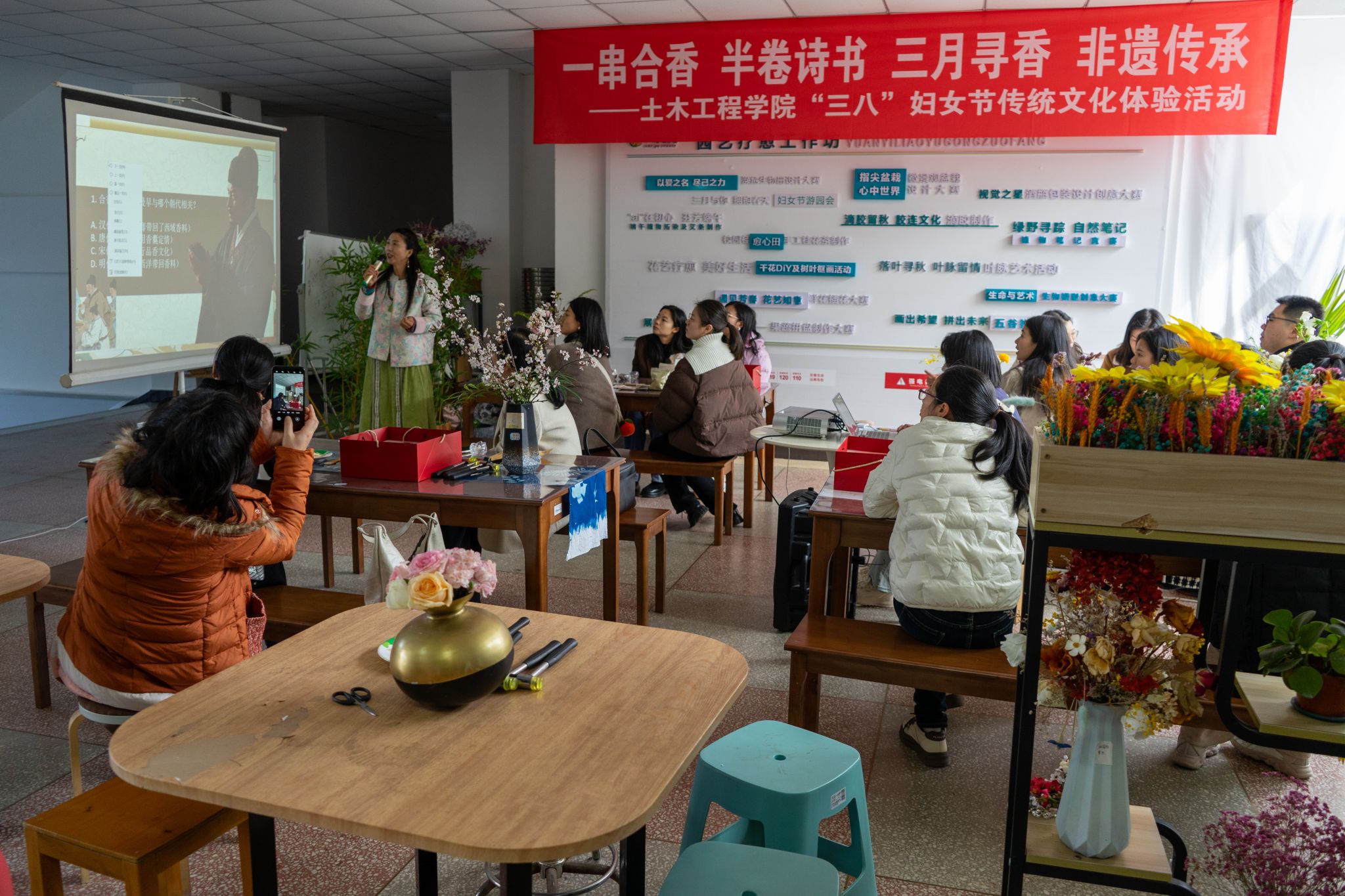 3月7日,慎思楼2栋3楼植愈工作坊内书香与合香交织,一场由生物科技协会承办,以“一串合香,半卷诗书,三月寻香,非遗传承” 为主题的土木工程公司“三八”妇女节传统文化体验活动在此温情上演。