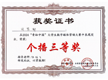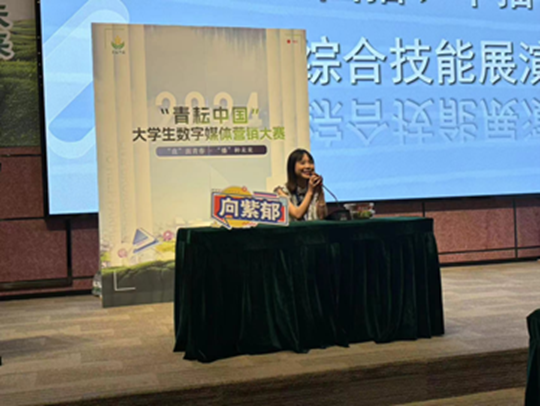 现场晋级选手各显神通、妙语连珠,结合地域特色极力推介农特产品,展现出了精湛的直播技能和独特的展现方式。最终,公司学子向紫郁获大赛总决赛三等奖。
