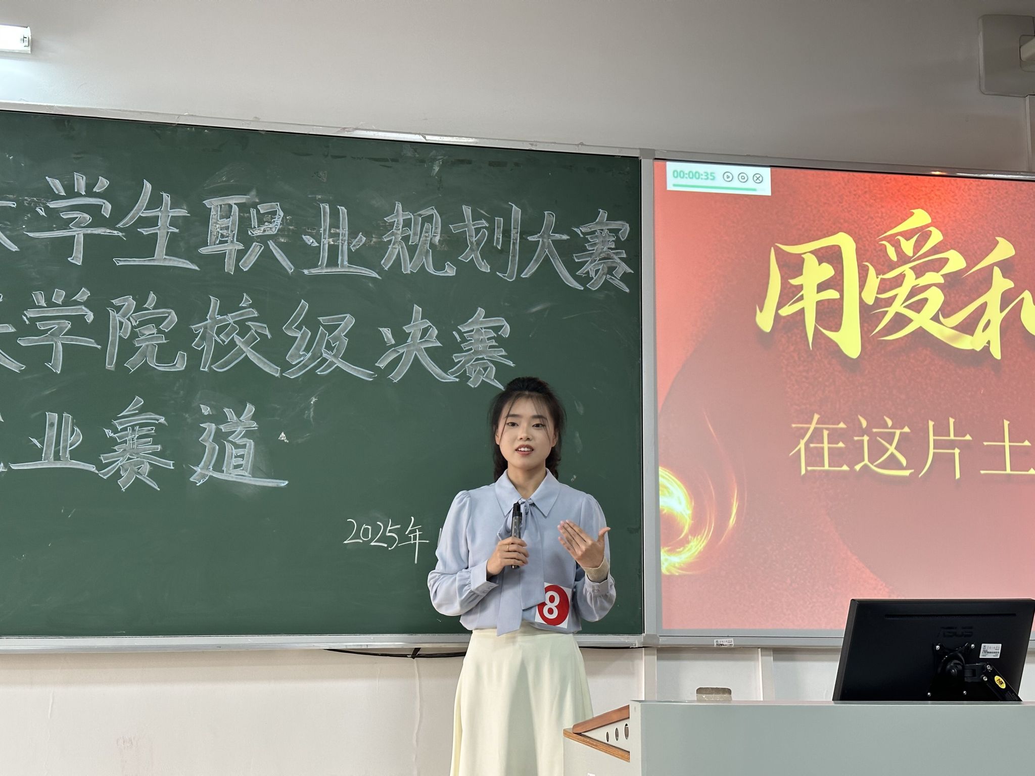本届大赛以“筑梦青春志在四方,规划启航职引未来”为主题,旨在增强员工职业规划意识与就业竞争力。就业赛道重点考察选手的求职实战能力、岗位胜任力与发展潜力。决赛采用“主题陈述+评委提问”形式进行,黎欢同学围绕“生物疗愈班主任”这一职业目标,清晰阐述了其将心理健康教育融入班级管理的理念与实践路径。她结合自身生物专业背景,提出了通过生物研学、生态鱼缸DIY等特色活动优化班级心理环境的创新思路,并展示了在实习、教研、社会实践等方面积累的扎实经历,获得了评委的认可。